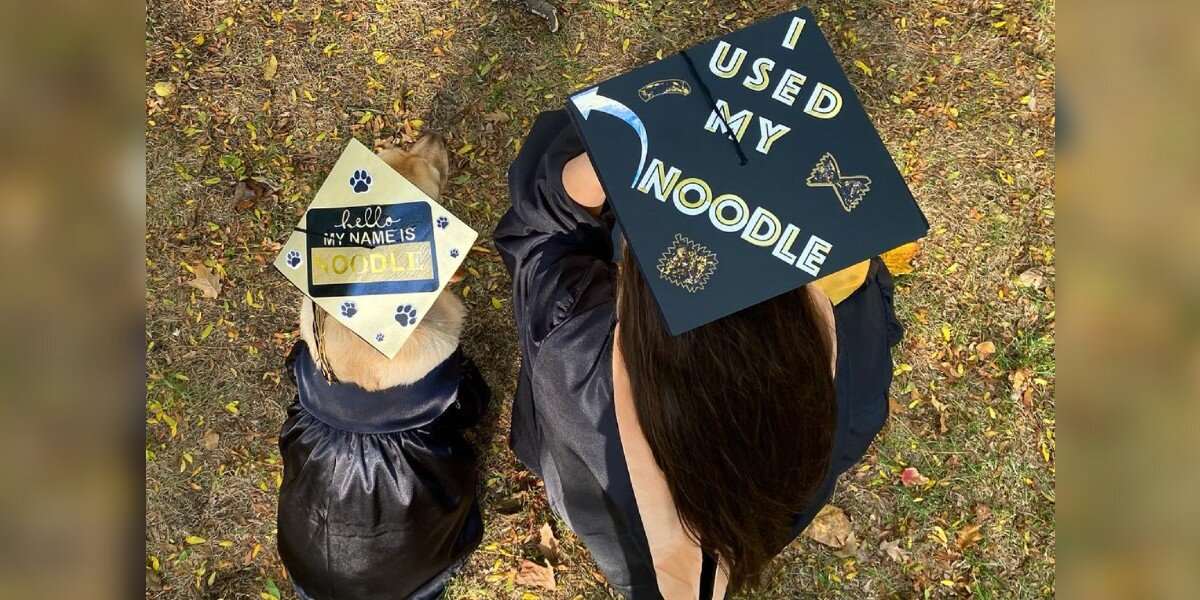 Noodle and Jacklyn eventually completed their internship at Disney World and returned to Indiana to receive their diploma. Even though Jacklyn did most of the logistical work on her own, she couldn’t help but feel that Noodle played a huge role in their success. So, when decorating her cap for graduation, Jacklyn came up with the perfect way to honor her trusted companion.