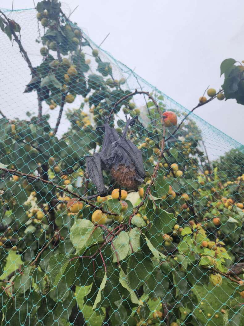 “Jonah’s weakened state made the rescue relatively easy,” Vintin said. “I carefully cut the netting around him using scissors, folded him into a bat wrap to mimic the safety of his mother’s wings, and placed him in a carrier before removing the remainder of the illegal netting from the fruit tree.”