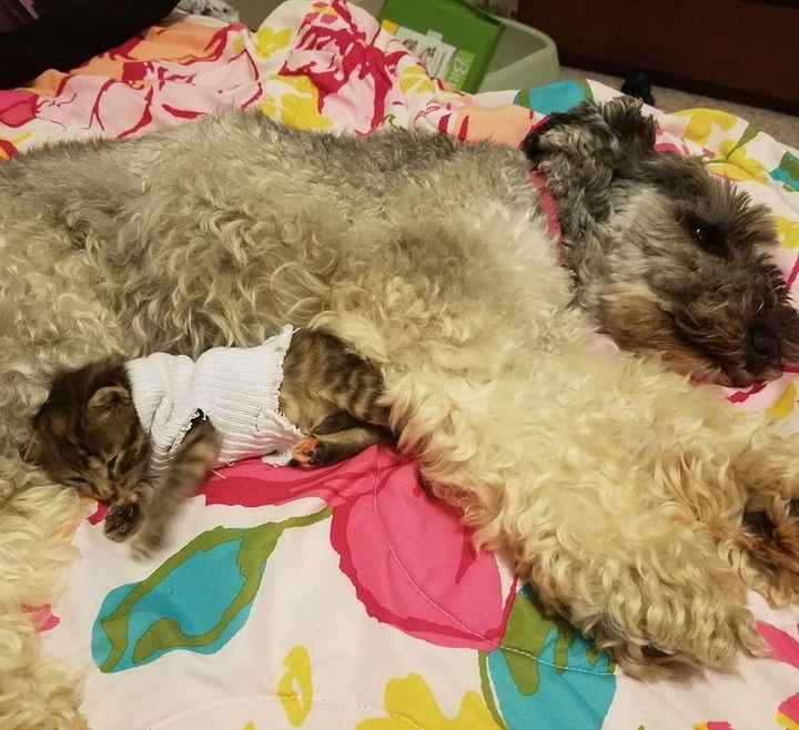 Sau khi bé Pipes chuyển đến ngôi nhà mới của mình, cô được chú chó Amelie chào đón và nhanh chóng rúc vào người bạn mới của mình để chợp mắt.