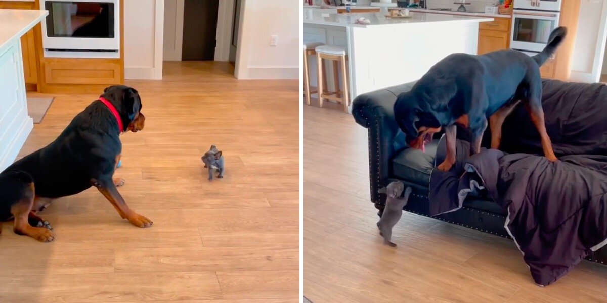Rottweiler có phản ứng đáng ngạc nhiên nhất khi gặp một chú chó con nhỏ